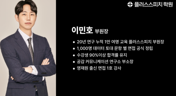 안녕하세요. 20년간의 면접 연구와 1만여 명의 합격생을 배출한 플러스 스피치 부원장 이민호입니다.